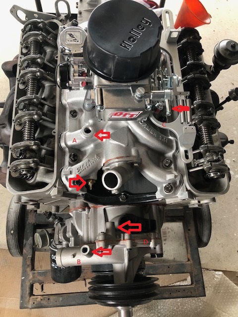 I am attempting to run-in a Rover 3.5 on a test stand which I have fitted a Edelbrock manifold and new Carb but as I am reasonably inexperienced would like some clarification on the 'plumbing up' of the engine so I can run her. Some of the connections are obvious but others I am not so sure about (see attached images). In any case I would really appreciate it someone could label each of the inputs/outputs and perhaps suggest which ones could be blocked or bypassed for the time being.