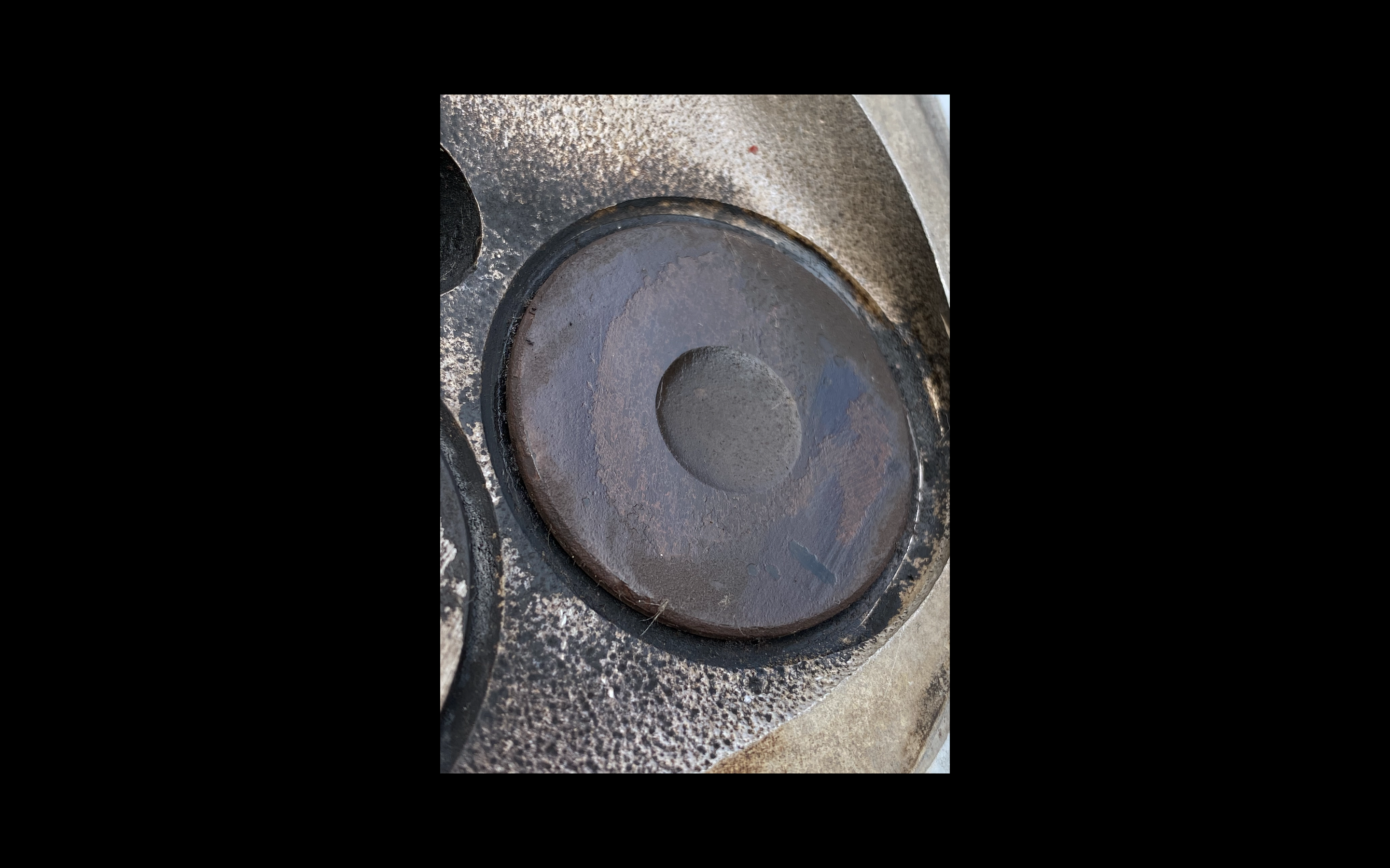 The appearance of the exhaust valve serving cylinder 5 is, as you can see, not the best looking either. All other 15 valve faces look as they should, really. The exhaust port for 5 was wet/oily unlike the others which were the correct 'dry' sort of appearance. Looking at the inlet stem for 5, there was a very small bit of 'rusty' looking blemishing on it but it scraped off easily.