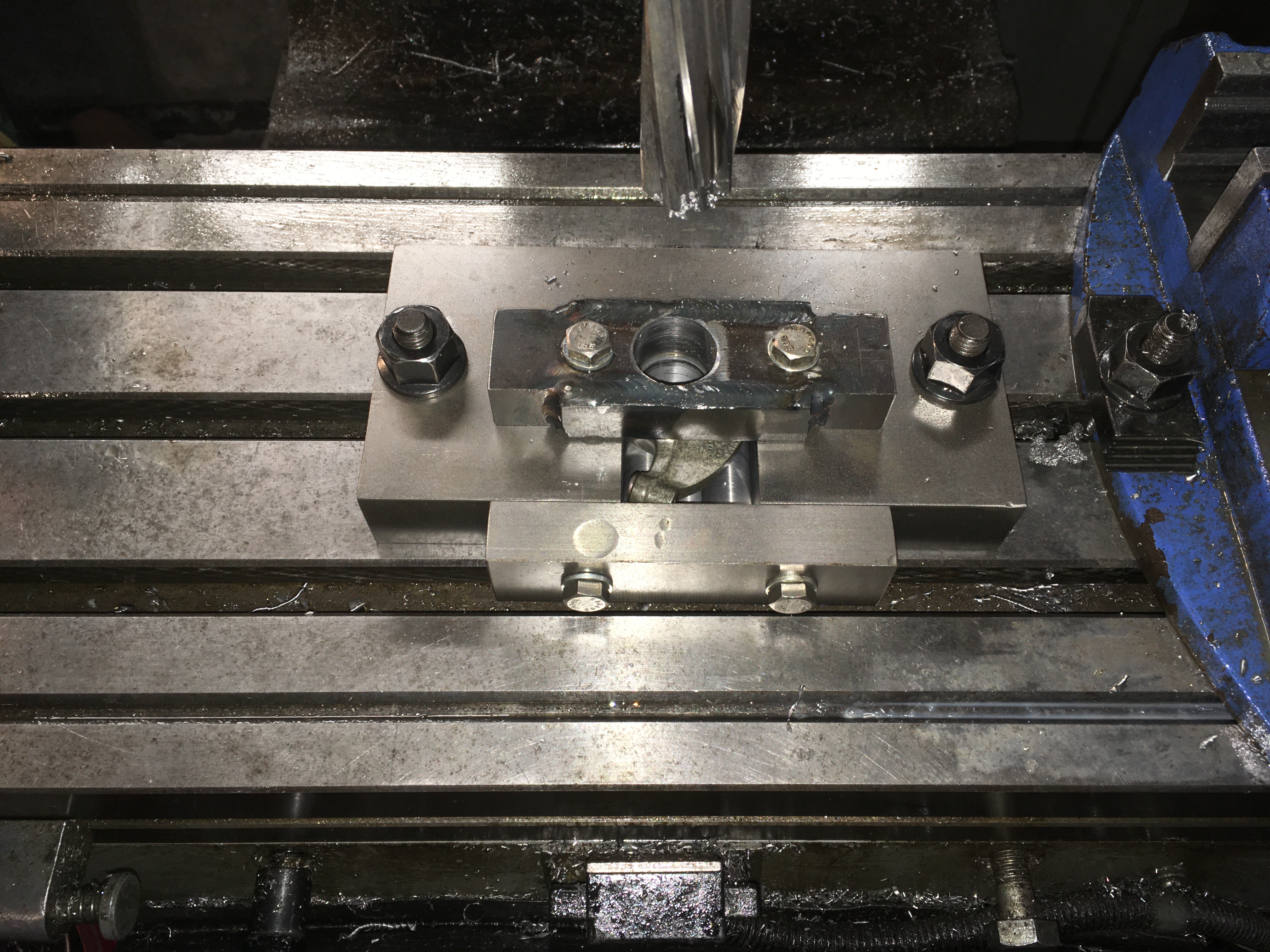 Next was to machine a mount into which the rockers can be placed securely so they can be first drilled to 22.5mm and then reamed to 22.98mm. I also machined a simple alignment tool so when the rocker is clamped the bed of the mill can be aligned with the spindle before machining the rocker. I utilised Land Rover flywheel dowel pins as locators to ensure I can repeatedly position the clamps accurately. Maybe overkill but it was fun.